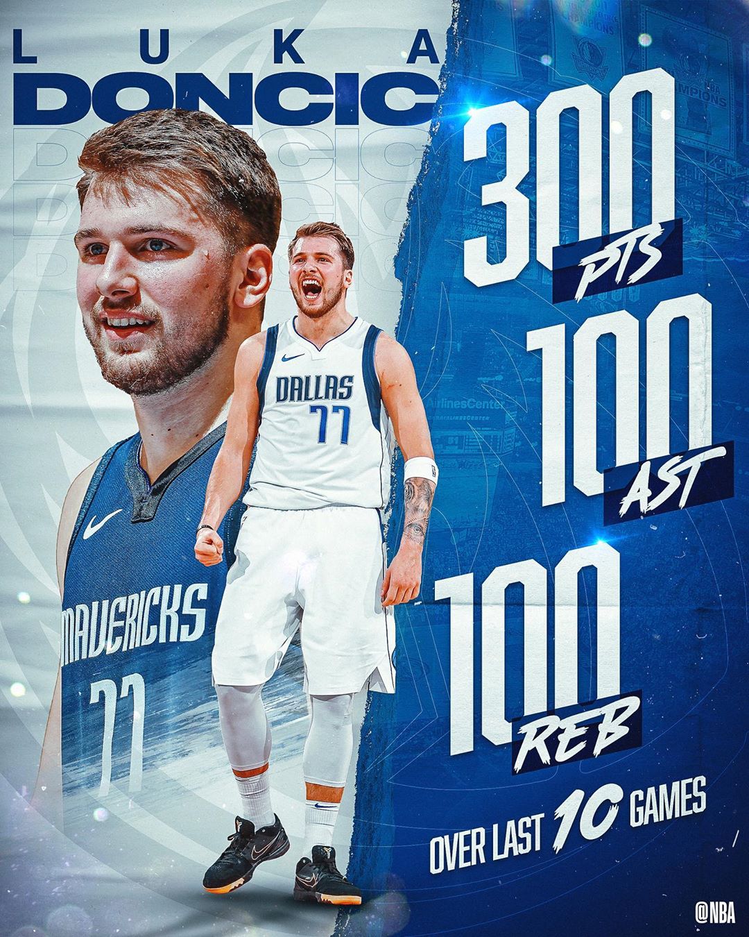 @lukadoncic has reached 300p, 100r & 100a over his last 10 games, making him the 5th player in @nbahistory to average a 30-point triple-double over any 10-game span!